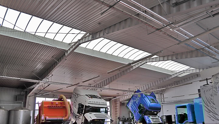 Naświetla kalenicowe w warsztatach bardzo dobrze doświetlają wnętrze hali do szerokości ok. 20 m.