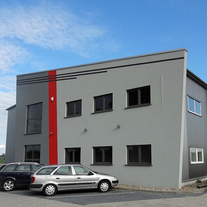 Dzięki oddzieleniu budynku biurowego od hali produkcyjnej inwestor zyskuje o wiele większą dowolność w doborze materiałów do wykończenia fasady budynku biurowego.